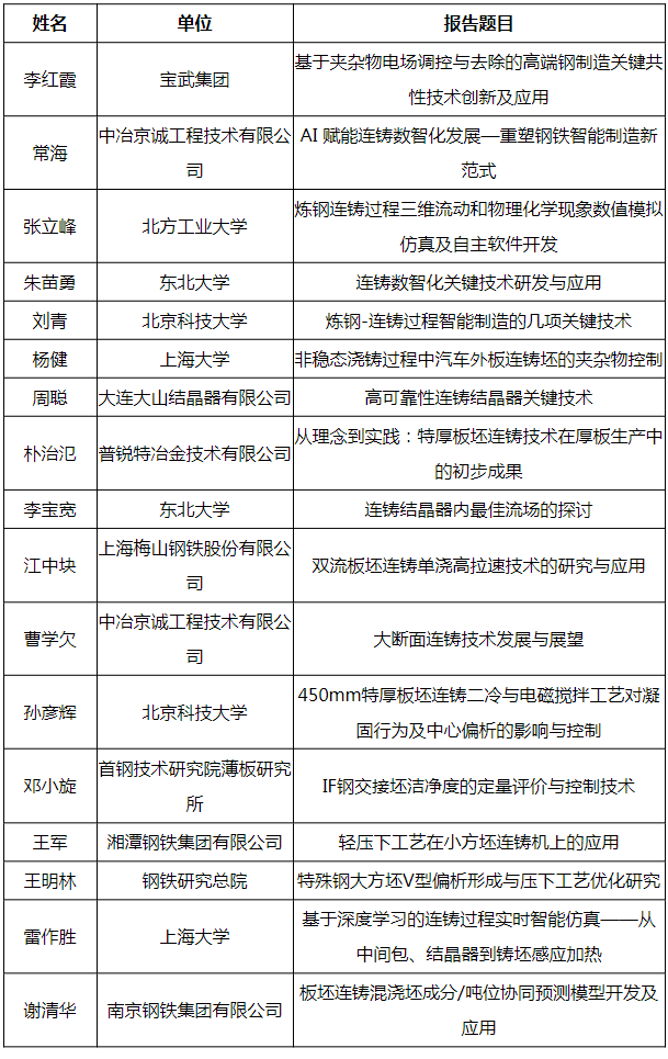 本次大会邀请多位连铸专家围绕会议主题作特邀报告;从会议论文中筛选代表性的学术论文做主会场和分会场重点报告;对连铸生产、技术现状进行有针对性的交流和研讨;汇集连铸学术观点,进行前瞻性的交流和研讨。会议将安排大会报告、邀请报告和口头报告。