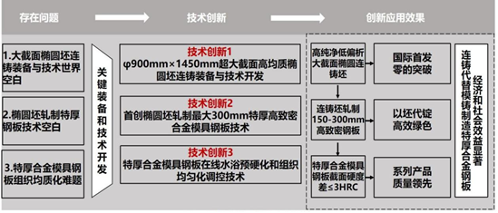 为此,兴澄特钢联合北京科技大学,在国际上率先提出了“超大截面椭圆坯连铸+异型坯轧制”的150-300mm厚度高均质模具钢板生产工艺,实现连铸替代模铸生产高均质特厚合金模具钢板。但该技术方案存在三大难题: