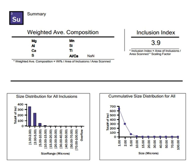 基于大规格椭圆坯连铸装备和全流程纯净化冶炼-低偏析连铸工艺,项目生产的椭圆坯其横断面的低倍质量达到了行业一级标准,椭圆坯连铸生产流程的成材率达到了96%,比模铸工艺高10%以上,效率高,成本低,便于工业批量生产。而且采用该工艺生产的718系列塑料模具钢椭圆坯,在其横截面碳波动<±0.04%,截面成分均匀。生产的连铸椭圆坯低倍,中心疏松0.5级,无明显偏析和缩孔。而且生产的模具钢板非金属夹杂物面扫指数3.9,夹杂颗粒大小集中在10μm以下(见图2),远优于模铸工艺。