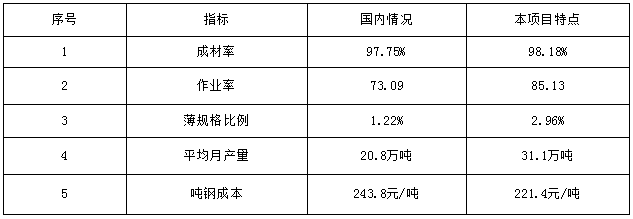 选取国内1780线热轧机组相关指标作为本项目的比较对象进行核心指标对比,如下表所示为与相近产线技术对比情况。同时,为了进一步说明优化升级后热轧机组整体能力水平的提升,选取成材率、产量、成本等指标进行对标。