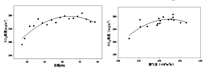 图3 焦粉对NOx浓度的影响,mg/m3 图4 烟气量对NOx浓度的影响,mg/m3