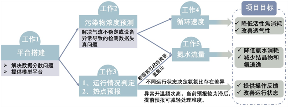 本项目围绕“活性焦烟气净化工艺控制模型研发及稳定应用”展开研究,首先研究烧结过程主要污染生成机理,通过烧结过程参数预测污染物生成浓度;然后基于污染物浓度预测,开发活性焦循环速度计算模型和氨水流量预测模型;最后将模型应用于现场一级操作系统,实现对活性焦系统操作的在线指导,保证系统实现稳定超低排放并降低关键物料消耗。各个阶段分步骤逐步推进,保证基础理论与工业实施循序渐进。项目总体研究思路如图1所示。