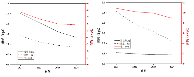 图20 项目实施以来烧结(上)和焦化(下)活性焦系统主要消耗变化