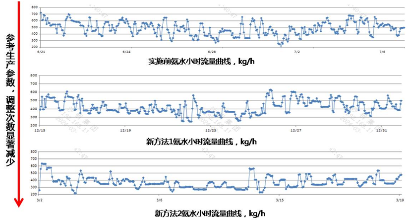 新方法1通过氮含量、转化率预测氨水平均流量,然后根据进出口NOx浓度变化在一定范围内调整氨水,氨水流量曲线稳定性提高,平均值下降至424kg/h。