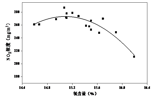 氧含量对NOx浓度的影响如图5所示,在氧含量较低时NOx浓度随氧含量升高有一定升高趋势,在氧含量较高阶段NOx浓度随氧含量升高而逐步降低。