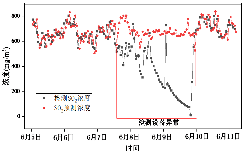 图2 某段时间内在线检测SO2浓度和预测浓度对比,mg/m3