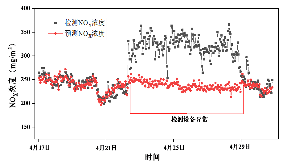 在述四个参数基础上,进一步结合温度和湿度等参数开发了NOx浓度离线预测模型,误差基本可控制在2%左右。以历史某一段运行数据为例说明模型功能和效果,如图6所示。