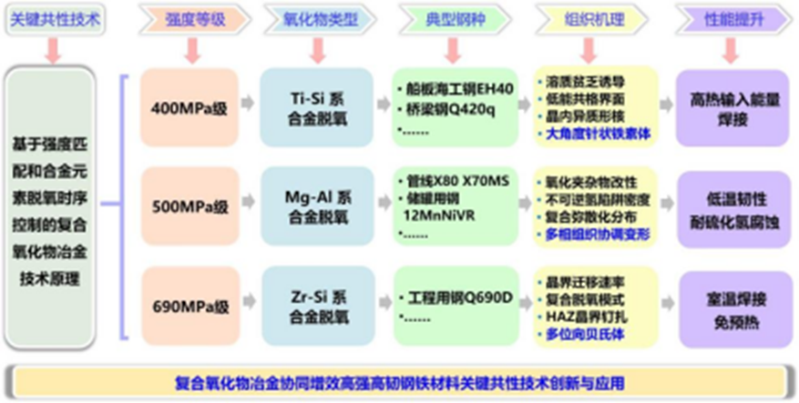 (1)关于复合第二相粒子精细化技术控制原理缺乏系统研究,针对脱氧合金体系、元素复合时序性、诱发组织相变机制、强韧性等级匹配等问题尚不明确,冶炼、轧制、冷却和热处理全流程中复合第二相粒子的演化行为和作用机理还未掌握。