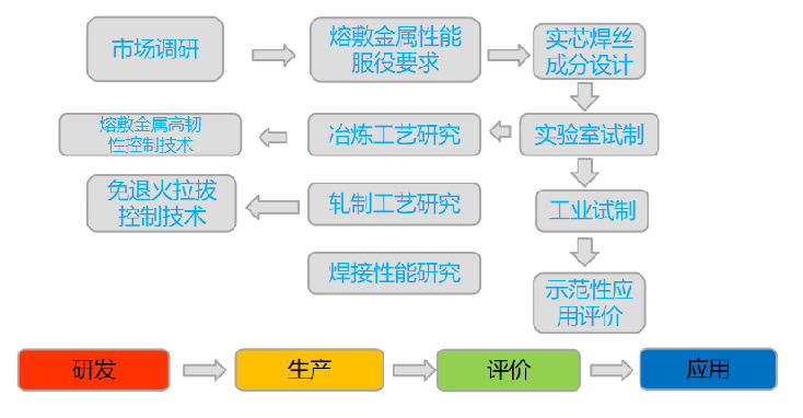 长期以来,国内钢铁企业对中厚板的研究较多,对各类应用场景的产品技术研究也比较超前,但对配套焊丝的研究缺远远落后于钢板,许多高端钢板材料研发完成后,无相应焊材或者被迫高价采购进口配套焊材。十四五期间,随着国家大力发展战略性新兴产业,工程装备及焊接制造工艺的升级对焊接材料及生产工艺也提出了更高需求,亟待开展特种焊材及其生产工艺的相关研究。为满足产品服役性能的要求,开展实芯焊丝钢成分设计、实验室试制、焊接试验、工业试制及示范评价等研究,完成研发-生产-评价-应用链。