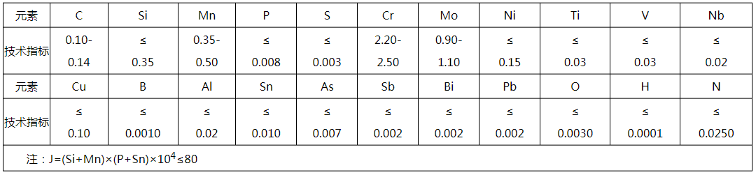 3、开发出转炉双联冶炼、电渣重熔生产高纯净2.25Cr1Mo耐热合金钢技术,优化了钢中夹杂物及贝氏体、α-铁素体,脆化敏感性系数J=42,有利于带状组织控制;通过正火加速冷却得到贝氏体+极少量铁素体组织,有效控制了模拟焊后热处理后的高温及室温性能。