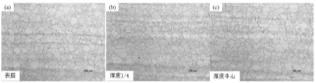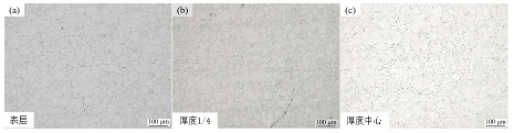 图4是多阶段能量均衡固溶处理后钢板金相组织。分阶段热处理能明显抑制钢板不同厚度部分的混晶现象,使晶粒度达4-5级。