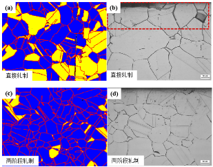 由图3可以看出,两种工艺再结晶程度和亚结构比例差别明显。采用高温大压下直接轧制工艺具有较高的亚结构比例,腐蚀后出现明显的晶粒脱落行为(红色虚线框);而两阶段轧制工艺使得亚结构比例显著下降,减弱了腐蚀扩展。
