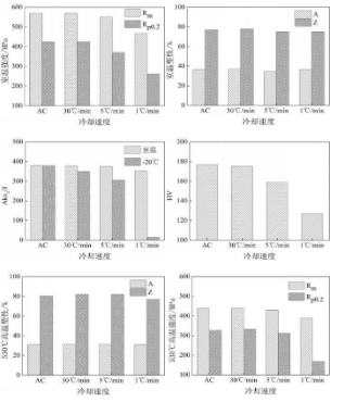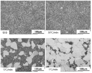 正火不同冷速下组织及性能变化如下:空冷获B+极少量α组织,强度较高;5℃/min冷却得α(30%- 40%)+P+B组织,强度略有下降;1℃/min冷却时α含量约80%,过饱和碳化物在晶界等析出聚集长大,产生应力集中,弱化晶界,降低材料强度。