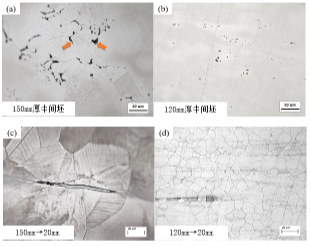 图1是中间坯和成品钢板组织形貌。其中,150mm厚中间坯在内部中心疏松和晶界处依然存在大量块状和条状铁素体(图1-1a),最终遗传至成品钢板,无法满足<1%要求(图1-1c);120mm厚中间坯的中心区域变形充分,中心疏松基本完全愈合,铁素体尺寸较小(图1-1b),通过后续加热、轧制使得铁素体充分溶解,实现成品钢板铁素体含量<1%要求(图1-1d)。