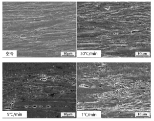 正火后不同冷却速度试样高温拉伸断口上取样进行纵向剖面扫描电镜SEM观察(见图2-8)。