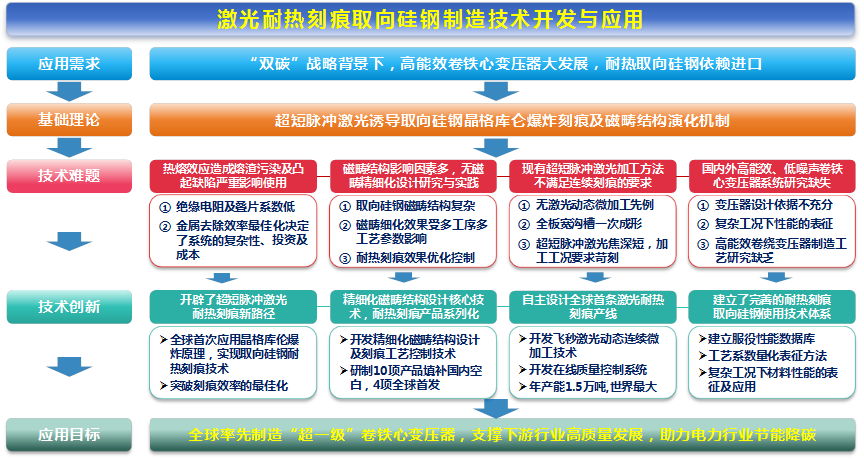 项目团队历时10余年,突破了激光耐热刻痕取向硅钢生产与应用各环节的原理与关键技术,取得了一系列重大创新性成果: