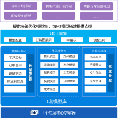 (4)面向多目标复杂场景的决策模型构建及动态优化技术:随着单机组决策模型应用的初步成熟,技术迭代正聚焦于多工序、多路径交织的多目标复杂场景,旨在实现成本、效率、质量等多维目标的动态平衡与全局优化。面向这类场景的决策模型构建及动态优化技术,通过构建覆盖全流程的智能决策体系,形成1个底层通用求解器、1套模型库和1套工具集,为供应链管理、生产排程、调度优化等各类决策场景应用提供支撑,破解传统静态决策模式在实时性、协同性和多目标权衡上的瓶颈,显著提升了决策的时效性与准确性。