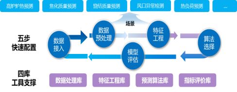 (3)面向通用场景的预测模型构建技术:针对钢铁生产中普遍存在的工艺参数预测、质量趋势预测与设备状态预测等需求,从“个性化开发成本高、周期长、复用难”的痛点出发,研究了预测模型标准化开发与平台化部署的新模式。通过突破建模工具组件的柔性解耦与组装、多算法集成算子库、算法自动调优以及训推协同的云边构建等关键技术,形成以“五步四库”为核心的工程化方法,将定制化配置与标准化流程结合,实现预测模型开发—训练—评估—部署—迭代的全流程自动化,显著降低开发门槛并缩短交付周期。提供全面、科学的算法调优工具,提升模型预测精度;支持使用云上算力训练、边端部署下发的平台化开发能力,具备模型自学习、自更新的能力。