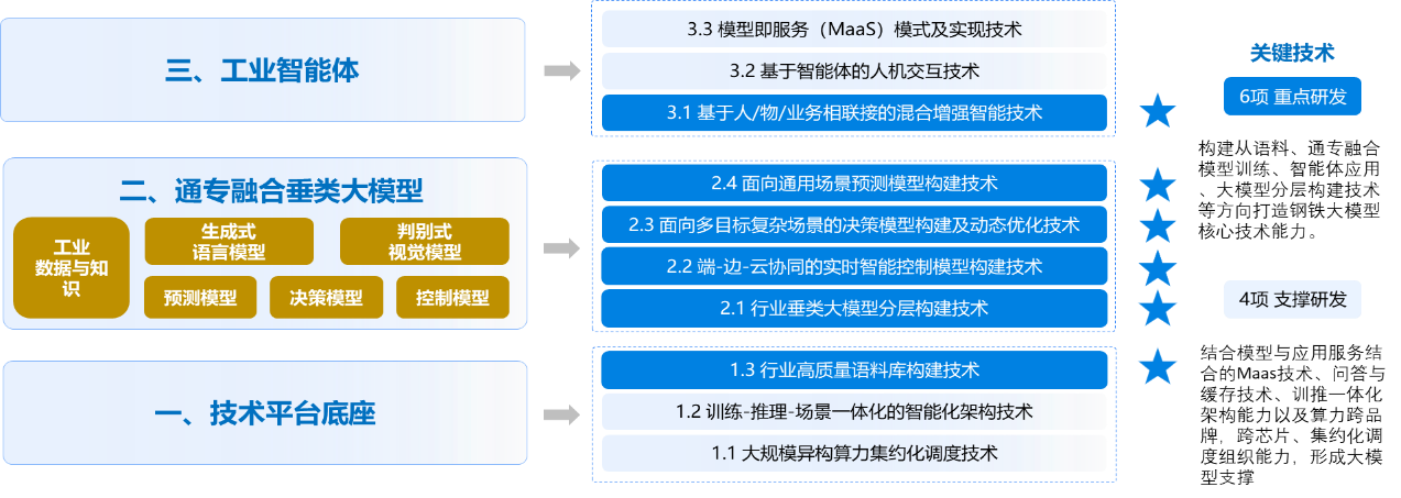 因此,亟需建设面向钢铁制造的“通专融合”垂类大模型,系统统筹数据、算力、模型与场景,打通“能力构建—业务闭环—价值度量”,形成可落地、可运营、可规模化推广的“AI+”解决方案体系,为行业智能化升级提供持续动能。