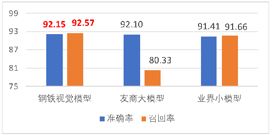 (1)安防管控:钢铁生产现场环境复杂,安全管控压力巨大,安防工作成为保障企业平稳运营的核心环节。结合业界先进深度学习算法和现场图片素材,研发安防视觉监控模型替代传统安全员人眼监测的方式,其中安全穿戴类模型识别准确率已达98%左右、安全作业禁区闯入类模型识别准确率也达到95%。