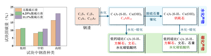 研发了脱硫石膏协同增强碳化技术。低铝、中铝和高铝钢渣的最佳脱硫石膏掺量分别为6.25%、11.11%和11.11%,被碳化钙含量增长率分别达13.62%、41.40%和71.46%(见图8)。揭示了脱硫石膏通过促进铝酸三钙、钙铝黄长石水化并生成单碳型产物而发挥催化作用的机制(见图9);提出了基于硅铝组分调控的增强方法,规模化生产时其最优掺量可取钢渣掺量的1/16。