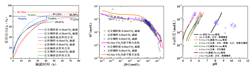 基于8种典型钢渣原料,提出了以活性钙含量为核心的钢渣碳化潜能评价方法。结果表明,钢渣活性钙含量主要分布于74%~90%,原料分析结果与碳化浸出试验结果高度匹配;结合电荷平衡、碳守恒、质量守恒及Phreeqc模拟,验证了方法的可靠性与普适性(见图5-7)。