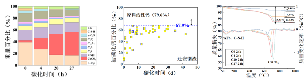 图2 碳化过程矿物转化规律 图3 被碳化钙含量-时间关系 图4 水化-碳化协同作用