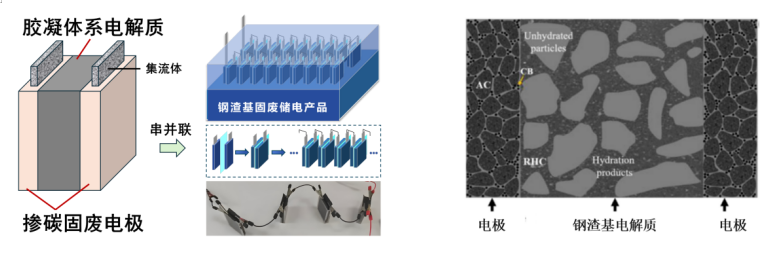 研发了由胶凝体系电解质与掺碳固废电极组成的钢渣基固废储电模块(见图13-14)。其中,钢渣协同高炉渣、脱硫石膏形成胶凝体系,C-(A)-S-H凝胶、钙矾石及铁尾矿共同构筑稳定骨架,并兼具隔膜作用;优选无机电解液注入孔隙,降低离子传输阻抗。碳基材料与钢渣基多源固废胶凝材料复配形成掺碳电极,其以“分散-接触-桥联”方式构建稳定导电网络。