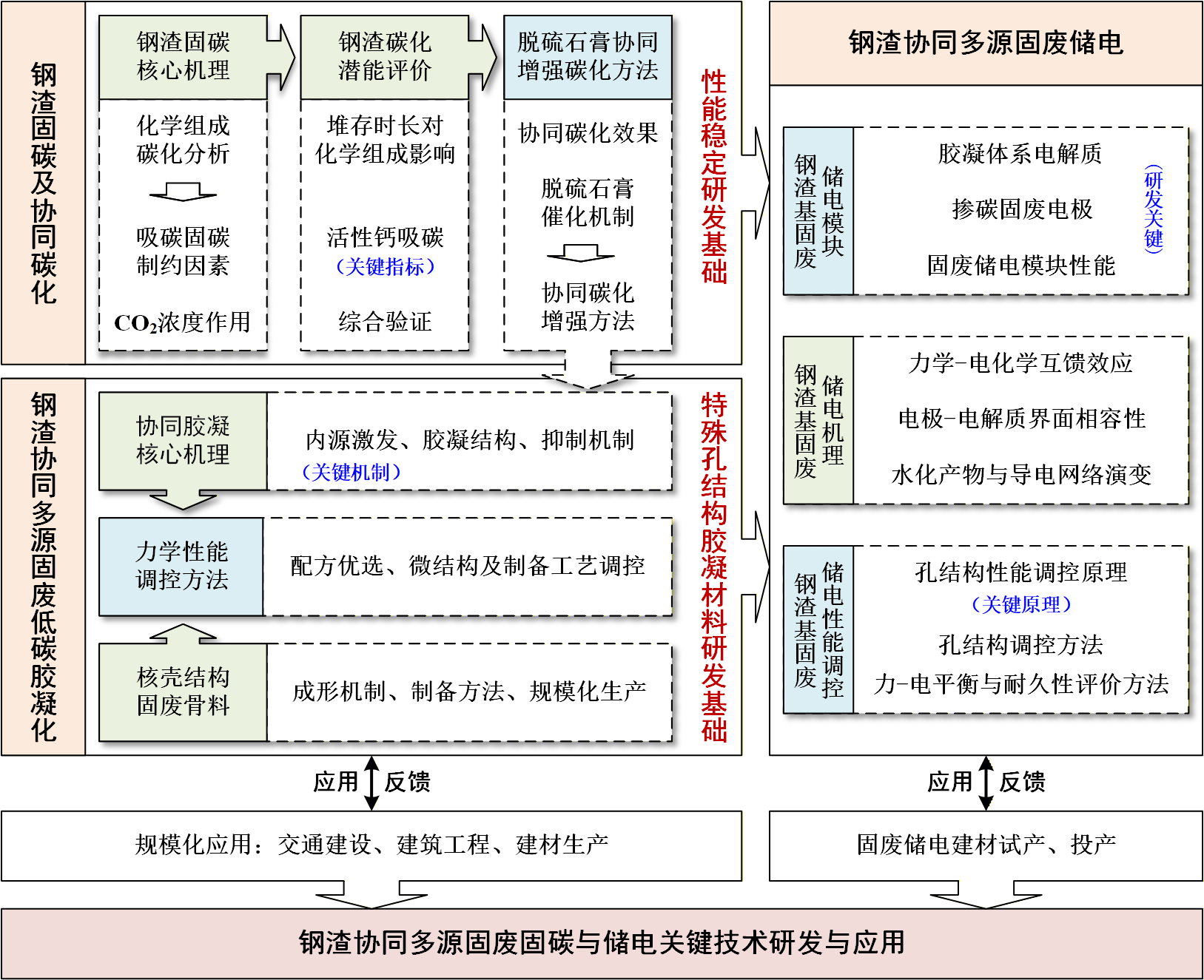 项目聚焦钢铁行业固废治理与国家能源战略的融合,探索将钢渣作为主体原料,协同高炉渣、铁尾矿等多源固废,研发钢渣固碳技术,消除体积安定不良缺陷,构建具有特殊孔隙结构的钢渣基胶凝体系,实现固废类建材承载、储电双重功能。