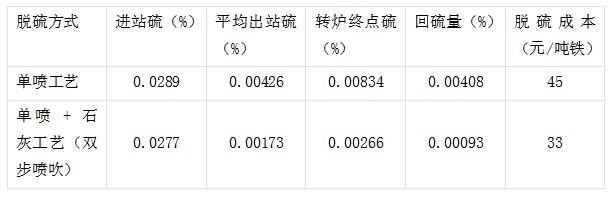 1、突破铁水预处理脱硅脱磷与脱硫的热力学矛盾,创新开发镁-钙双步喷吹深脱硫工艺与倒罐站同步脱硅工艺。倒罐站同步脱硅工艺实现脱硅处理与倒罐作业同步进行,脱硅率稳定在50%-70%;镁-钙双步喷吹工艺使平均出站硫含量由0.00426%降至0.00173%,转炉终点硫含量降至0.00266%,回硫量仅为0.00093%,实现[S]≤0.0015%的深度脱硫目标,脱硫成本降低约12元/吨铁。