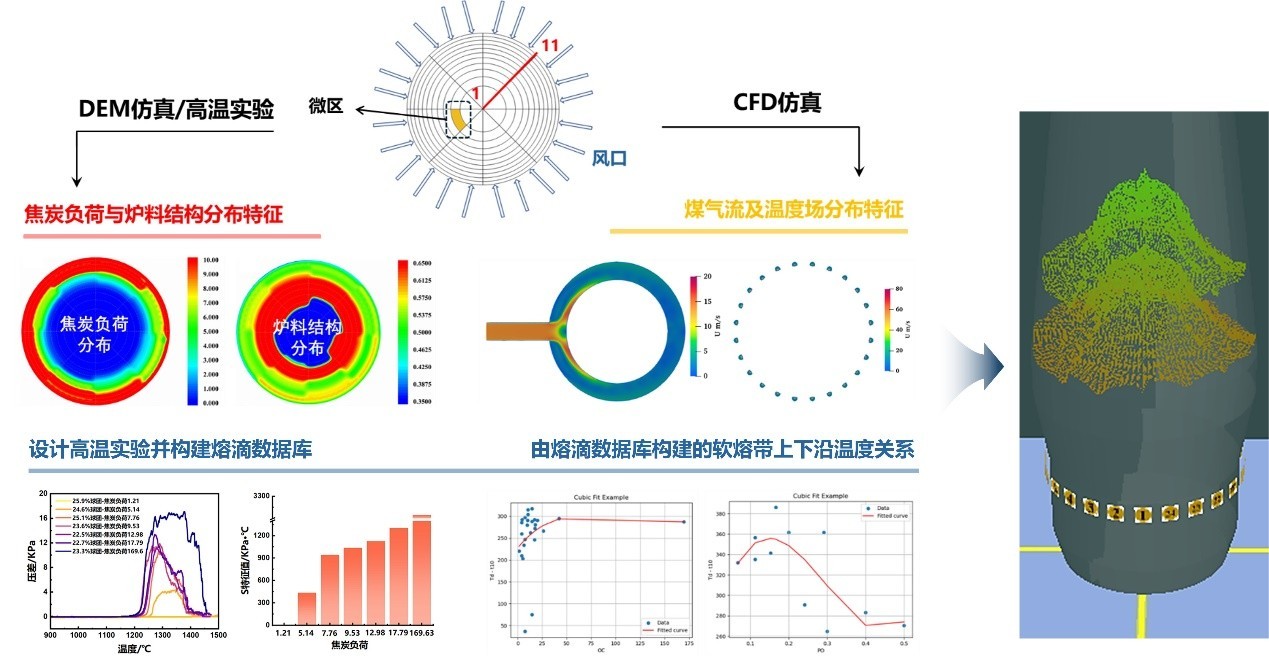 3、提出了以软熔带形态为桥梁、以渣铁反应限度为目标的高炉炉况与铁水质量调控技术架构。首次提出随机微分方程与机器学习相耦合的高炉操作时滞定量辨识方法,首创面向高炉内部不可观测、多相动态演化工况的软熔带机理-数据一体化快速预测方法,通过多模型协同与数据库支撑,实现了软熔带形态的实时定量预测。从分子层面揭示了桥氧形成机制及键能差异,创新开发了精细化桥氧结构的炉渣黏度非线性预测模型,构建了基于自由氧浓度的硫容量机理-数据融合预测模型,创新构建了区分“操作制度—时滞窗口”的长、短序列双编码器铁水硅磷预测模型,实现了对多元复杂渣系性能及铁水关键成分的高精度实时预测,基于“状态感知-演化预测-决策优化-调整反馈”架构开发了高炉喷煤量闭环控制技术。