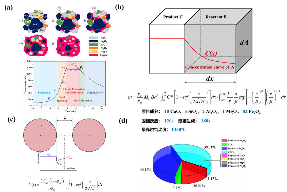 (a) 高温同化反应的微观演化示意,(b)固相反应过程示意,(c)固液溶解过程示意,(d)最终烧结矿物相组成预测