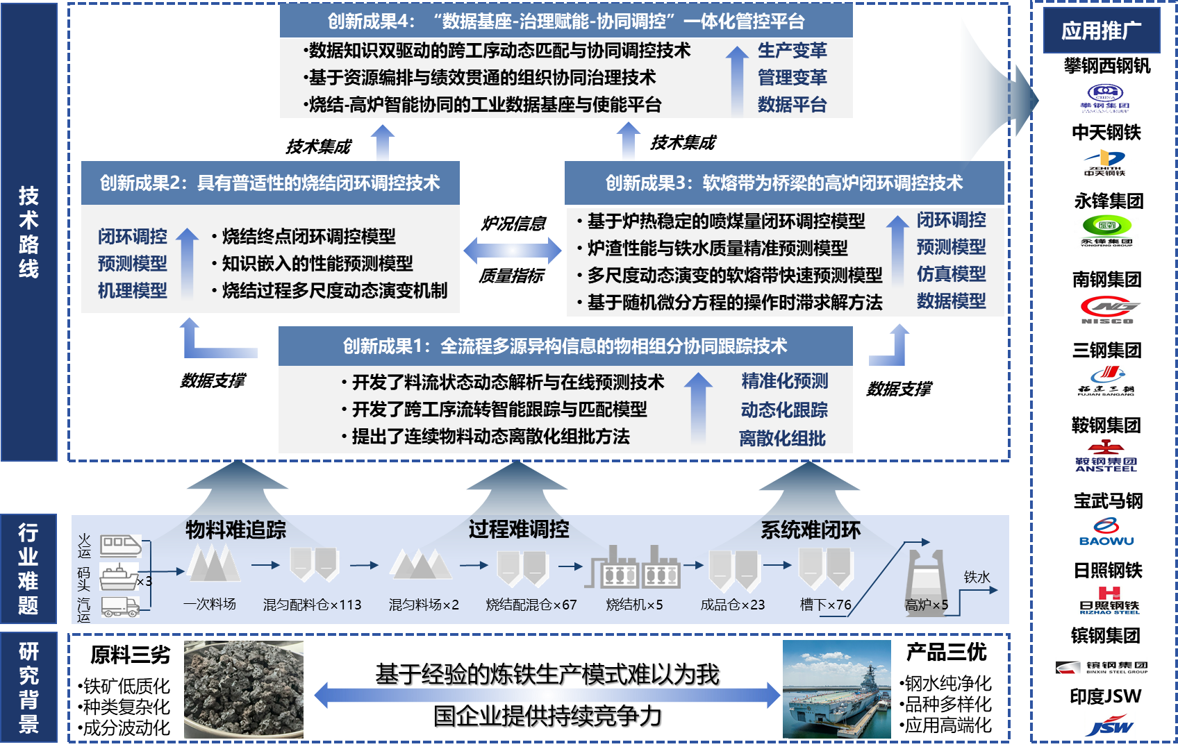 基于烧结-高炉协同管控平台,本成果实现了从数据感知、组织机构到生产协同的全面革新,实现了物料组分的闭环控制,推动生产模式从分段管控到协同优化的范式变革。成果已在多家钢铁企业成功应用,支撑企业实现成本与质量等战略目标横向贯通到边、纵向下沉到岗,在原料波动条件下同步提升了铁水质量与高炉运行稳定性,有力推动了我国钢铁工业向高端化、绿色化、智能化方向转型升级。