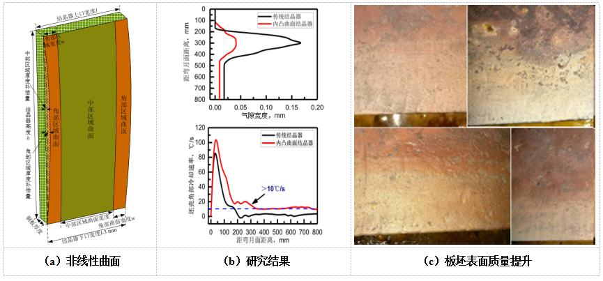 (3)高拉速板坯连铸结晶器非线性补偿曲面设计,准确补偿坯壳沿宽度方向热收缩在高度方向的非线性变化,有效消除角部气隙与厚渣堆积,将结晶器中下部冷却速率由3.5℃/s提升至10℃/s以上,促进板坯晶粒细化,显著减少板坯角部裂纹。