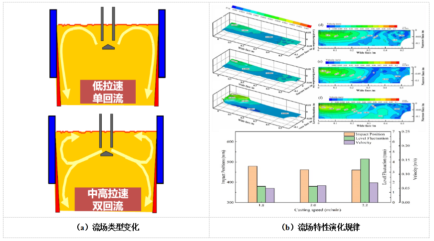 (1)高拉速板坯连铸结晶器内钢液流动特性研究,明晰了拉速1.8~2.2m/min下结晶器内流股的冲击点位置、弯月面波动幅度与界面流速的变化规律,准确探明了水口高速流股引发上回流湍动能激增与“结晶器-辊列”频率耦合导致液面剧烈波动的机制。