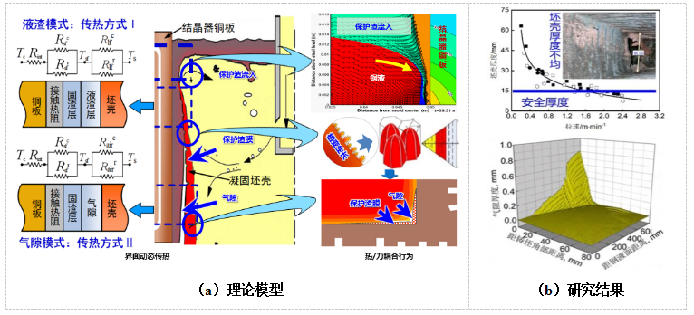 (1)高拉速条件下结晶器内初始凝固理论研究,针对拉速提升导致热通量增加、初生坯壳减薄、润滑恶化、易引发漏钢与裂纹的难题,精准揭示了高拉速连铸结晶器内坯壳凝固生长规律以及坯壳-铜板界面间隙形成机制,为高拉速结晶器装备技术改进提供了理论依据。