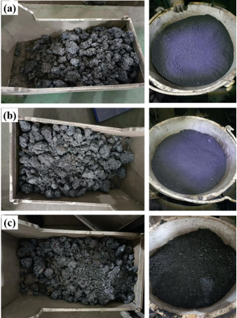 (a) 基准方案;(b) 配加不破碎的磁铁块矿;(c) 配加破碎预处理后的磁铁块矿
