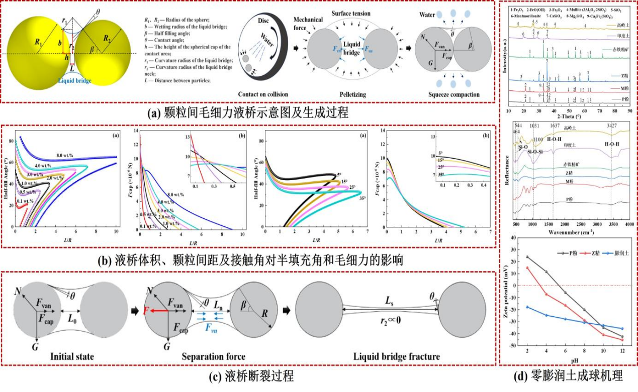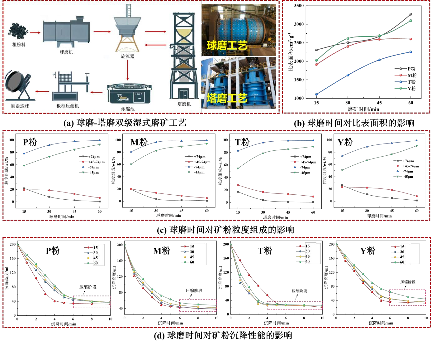 长期以来,我国球团生产原料以磁铁精矿为主流矿种,赤褐铁粉矿(赤铁矿以及含结晶水的褐铁矿、半褐铁矿等)通常用于烧结工序。矿产资源储量表明,赤褐铁粉矿在全球范围内分布更为广泛,价格优势突出。开辟赤褐铁粉矿在球团中的应用对拓宽球团原料来源、降低生产成本意义重大,并与钢铁行业“双碳”战略目标高度契合。然而,赤褐铁粉矿需磨矿预处理后才能用于生球制备,该过程在实际应用中仍面临若干技术难题:(1)干式磨矿效率低,设备损耗严重,且对于含有结晶水的褐铁矿,干磨时易结块,效率进一步降低;(2)湿式磨矿后易产生泥化锁水现象,脱水难度大,导致滤布堵塞;(3)焙烧温度高且适宜区间窄,赤褐铁矿原生Fe₂O₃不仅需要相对较高的再结晶温度(通常1300℃左右),且体系缺少氧化放热过程,赤褐铁矿球团往往存在着固结难、强度低、焙烧温度区间窄等系列问题。此外,赤褐铁粉矿具有亲水性强、黏性高等特点,在成球过程中可减少膨润土依赖,有利于进一步降低生产成本、提高球团品位、减少碳排放。然而,低膨润土添加量会导致造球适宜水分区间变窄、水分控制难、爆裂温度降低等不良后果。