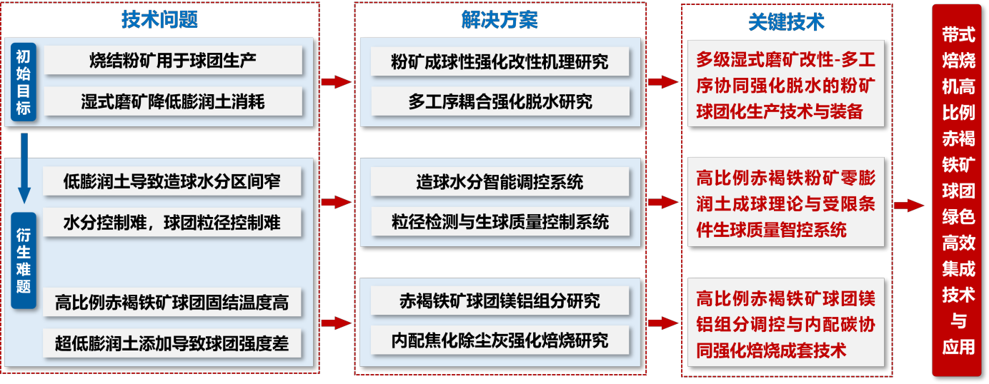 针对上述问题,中天钢铁集团(南通)有限公司联合安徽工业大学、北京科技大学和中冶长天国际工程有限责任公司,在国家自然科学基金面上项目、安徽省杰青项目以及多项校企产学研项目的持续支持下,系统解析赤褐铁粉矿球团化技术实施问题及其原因,连续开展了三大关键技术攻关:“多级湿式磨矿改性-多工序协同强化脱水的粉矿球团化生产技术与装备”、“高比例赤褐铁粉矿零膨润土成球理论与受限条件生球质量智控系统”及“高比例赤褐铁矿球团镁铝组分调控与内配碳协同强化焙烧成套技术”。