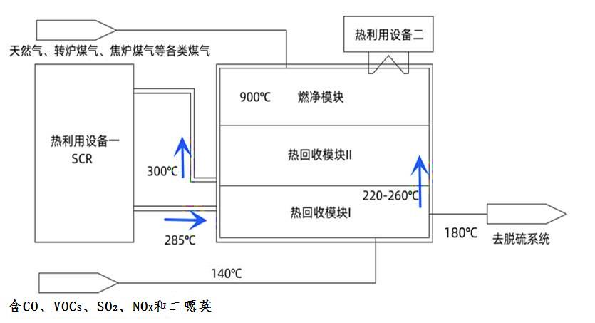 该装备的工艺路线为:除尘烟气依次经过间接换热模块、蓄热模块回收热能升温,在燃净模块内充分燃烧,温度达到850℃左右,去除CO、VOCs并产生热量,燃净后高温烟气再次通过蓄热模块,以换热形式将热量传导新进入的低温烟气以回收热量,如果热量过剩,还可以设余热锅炉以蒸汽或电力形式回收热量,烟气温度达到280~350℃后进入SCR脱硝模块去除NOx,脱硝后烟气最后再进入间接换热模块换热,温度降低到180℃以下,进一步回收热能后,将去除CO、VOCs、NOx多污染物的净化烟气排出。