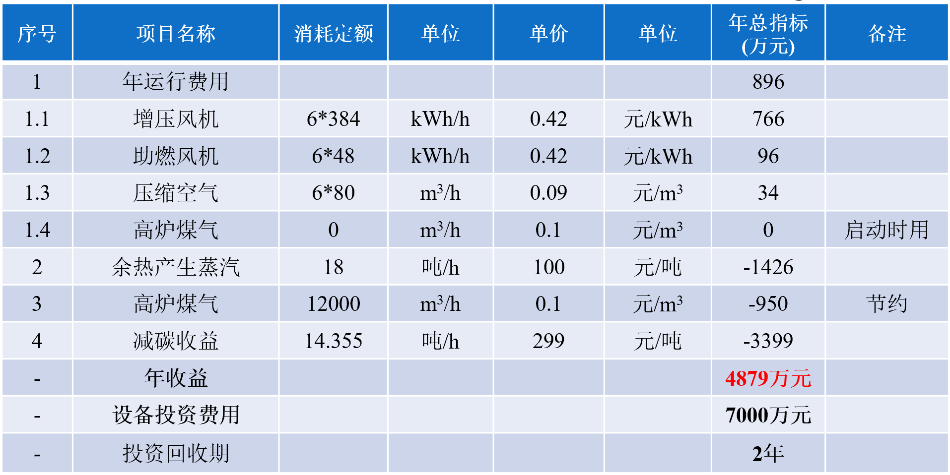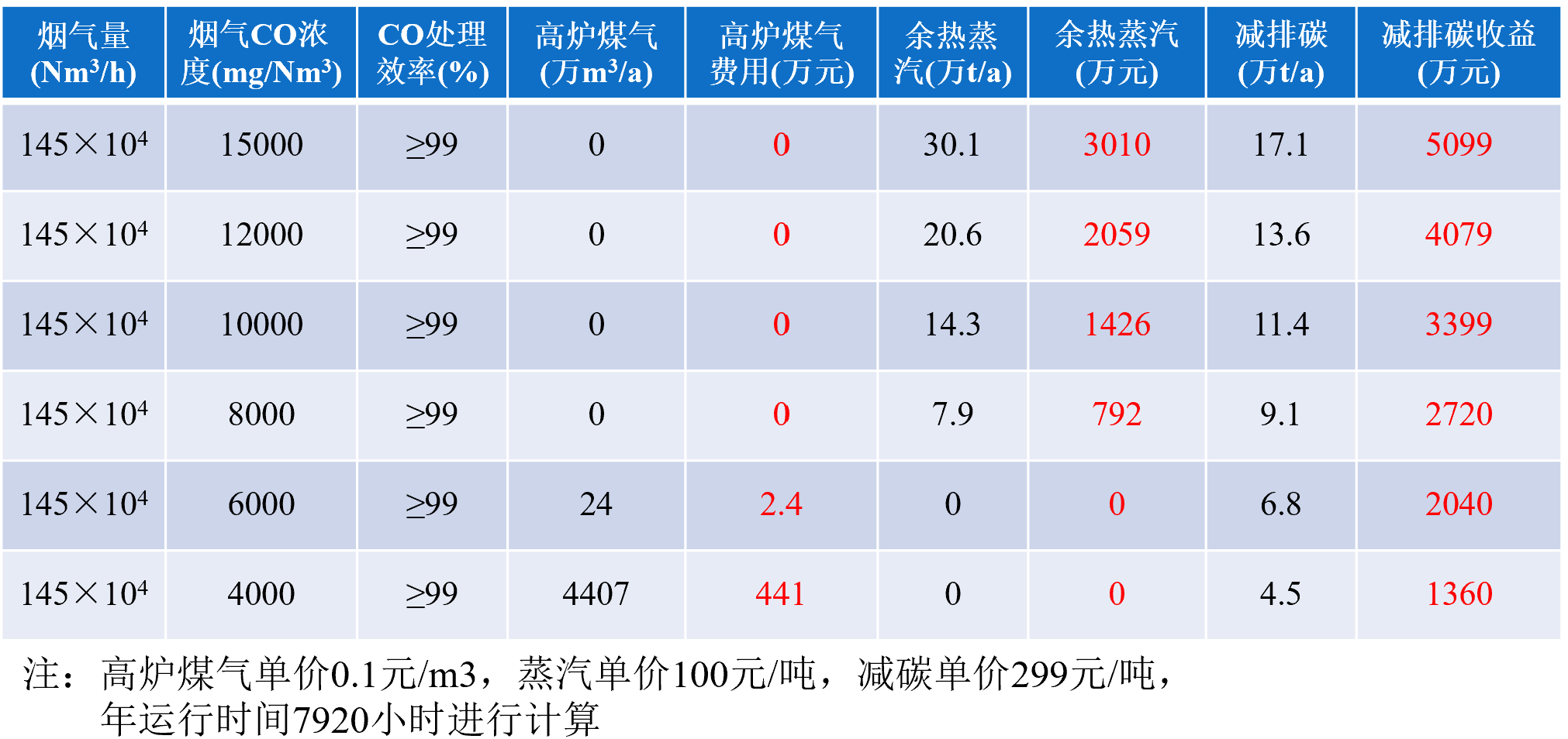 在此CO浓度下,系统达到自平衡,正常运行无需消耗额外高炉煤气,多余热量用于产生蒸汽或发电,预计可产蒸汽约为17吨/小时,年收益为1400万元,如果按照原系统使用直燃炉加热,则需要额外消耗12000立方/小时高炉煤气,现在每年可节约950万元;如果考虑环保减碳税收益,扣除运行费用,预计年收益在4800万左右;考虑设备投资及维修费用,预计投资回收期在2-3年左右,经济和社会效益显著。