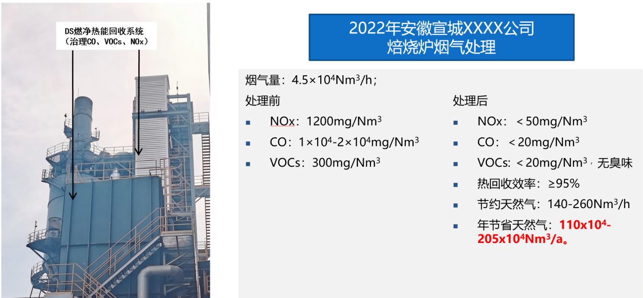具体流程图下:将间接换热器GGH 冷测出口烟气引入DS燃净热能回收系统进行净化处理、升温,充分利用烟气中CO高温氧化产生热量,维持自身运行,满足SCR 脱硝反应所需温度,替代原烟道烟气加热直燃热风设备,多余热量可用于余热锅炉产蒸汽发电。烟气(87℃) - GGH 冷侧(180℃) - DS燃净热能回收系统(850℃) – SCR(210℃) – GGH 热侧(114℃) - 增压风机 - 排放。